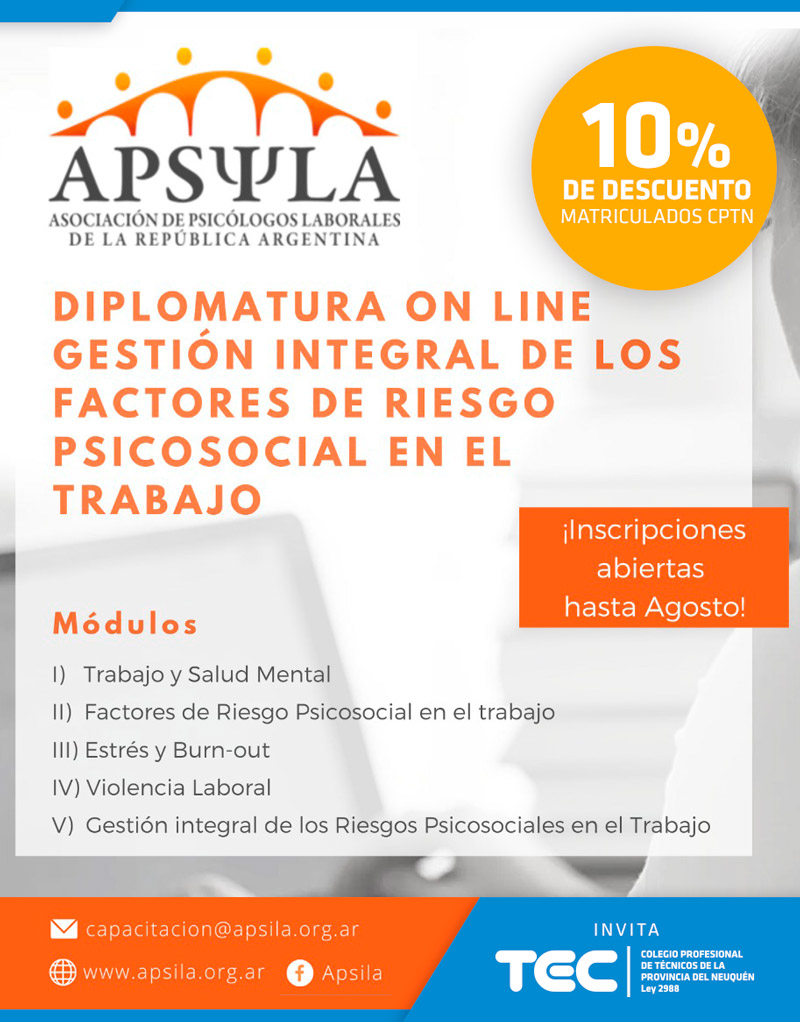 Nuevo convenio con APSILA para brindar un descuento del 10% a matriculados CPTN en Diplomatura online en Gestión Integral de los Factores de Riesgo Psicosocial en el Trabajo
