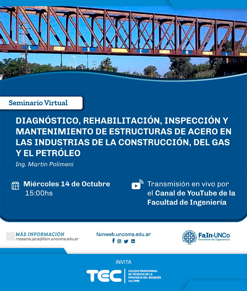 Invitamos a los profesionales matriculados al Seminario Virtual en Diagnóstico, rehabilitación, inspección y mantenimiento de estructuras de acero en las industrias de la construcción, del gas y el [...]