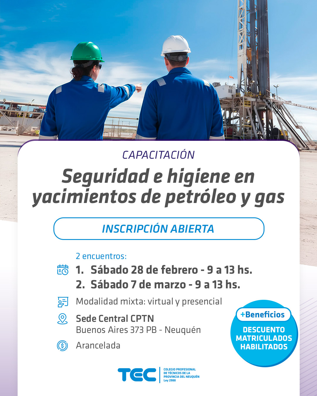 Invitamos a los profesionales vinculados a la seguridad e higiene y la industria petrolera a la capacitación mixta (virtual/presencial) en "Seguridad e Higiene en yacimientos de petróleo y gas".