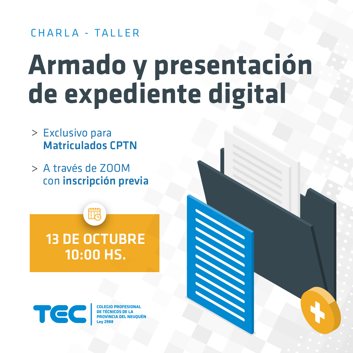 Invitamos a todos los profesionales matriculados a participar este martes 13 de octubre a las 10 hs. de la capacitación en Armado y Presentación de Expediente Digital, en modalidad charla-taller a través de Zoom. Exclusiva para Matriculados CPTN.