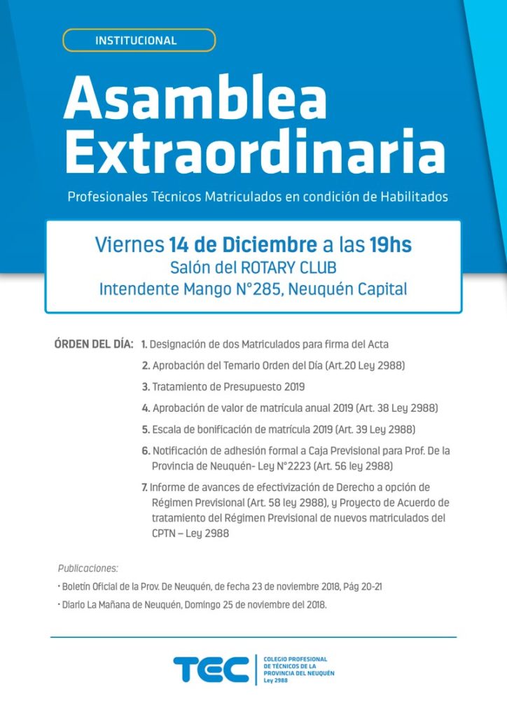 Se convoca a los Profesionales Técnicos Matriculados en condición de Habilitados del Colegio de Técnicos de la Provincia del Neuquén Ley 2988, a participar de la Asamblea Extraordinaria a Realizarse el día Viernes 14 de Diciembre de 2018 a las 19hs, sita en Intendente Mango N°285, en el Salón del ROTARY CLUB de la Ciudad de Neuquén Capital, con el objeto de tratar conforme a lo establecido los siguientes puntos: