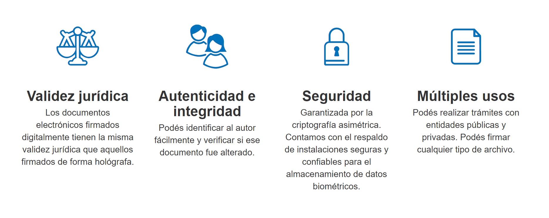 Conforme la Ley 25.506, la firma digital cumple las mismas exigencias que la firma manuscrita de los documentos en papel, ya que posee las mismas características técnicas de seguridad que una firma en papel, e incluso mayores.