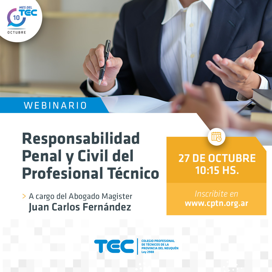 Invitamos a todos los profesionales matriculados a participar este martes 27 de octubre del Webinario: Responsabilidad Penal y Civil del Profesional Técnico, a cargo del Abogado Magister Juan Carlos Fernández.