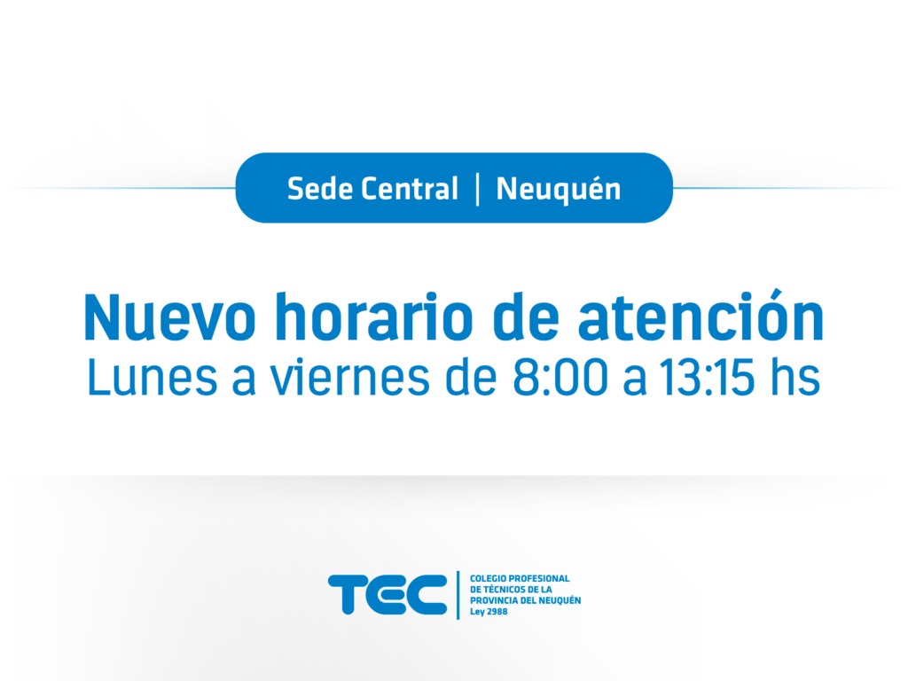 Informamos que la Sede Central del Colegio, ubicada en Neuquén Capital, modificará sus horarios de atención al público a partir del lunes 10 de junio.
