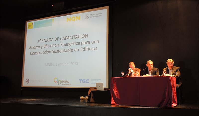 El pasado martes 2 de octubre se realizaron las primeras “Jornadas de capacitación. Ordenanza 13.515 de ahorro y eficiencia energética en la construcción de edificios sustentables” en el auditorio del Museo Nacional de Bellas Artes – Sede Neuquén, coorganizado por la Municipalidad de Neuquén, el Colegio de Técnicos de Neuquén, el Colegio de Arquitectos y el Colegio de Ingenieros de la Provincia.